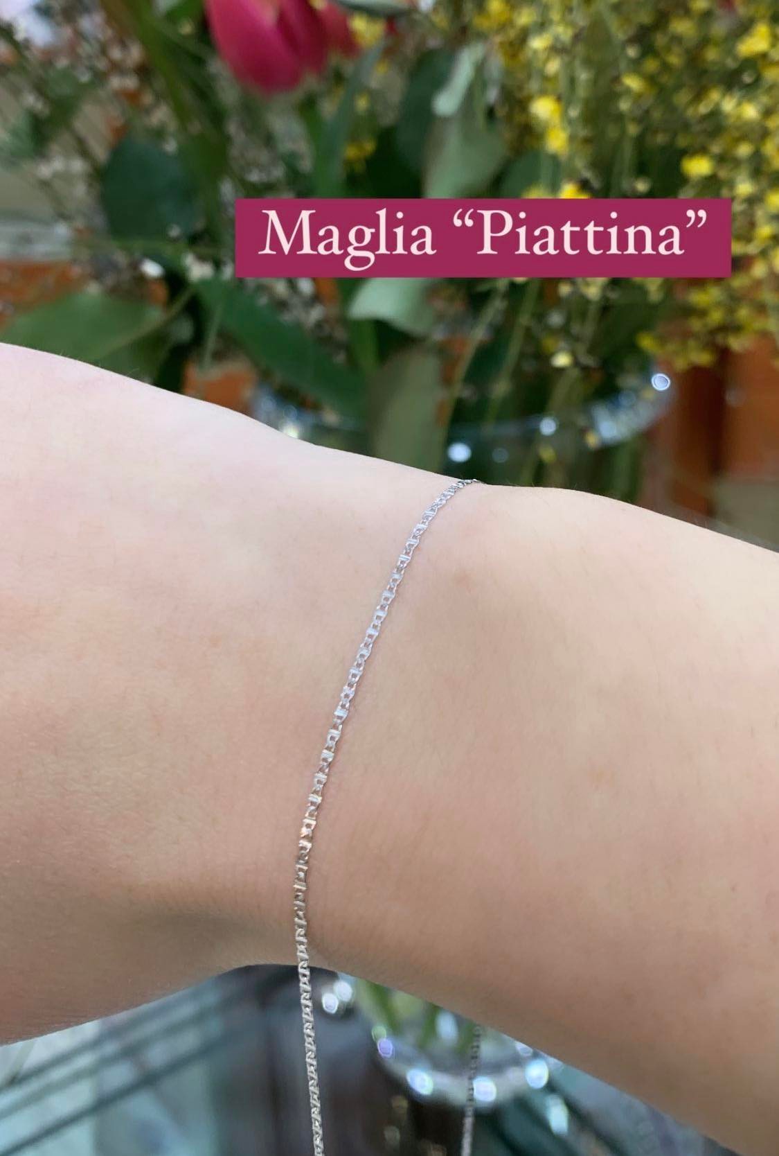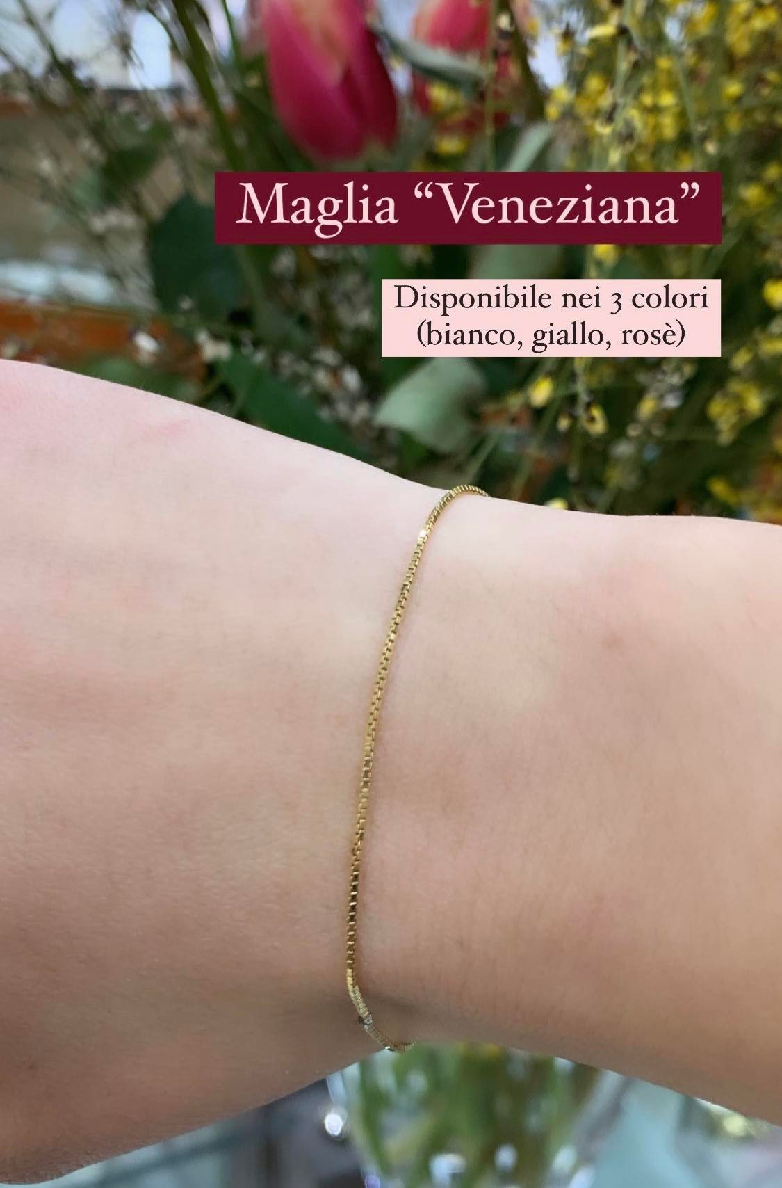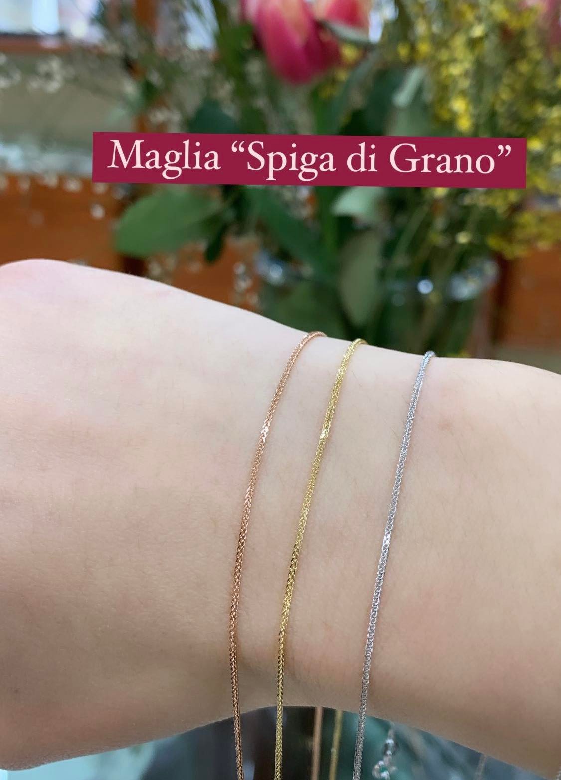 Potrai scegliere il tipo di "maglia", le dimensioni e il colore (oro bianco, oro giallo, oro rosa).